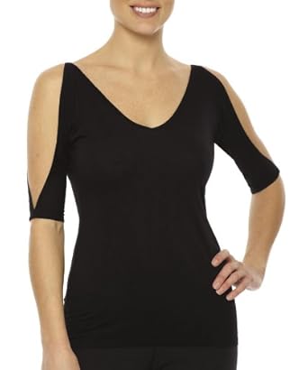I really liked this top. Light weight and elegant, it can be worn in a variety of settings. My shoulders are fairly narrow, but I didn't have issues with the neckline and sleeves staying put. The fabric is a very light jersey so it might be well to order a size that will ensure that it hugs the body a bit, so the shoulders and sleeves stay put during active exercise.