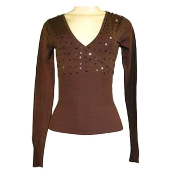 Brown Long Sleeve V-neck Sweater With Sequin Trimmed Front