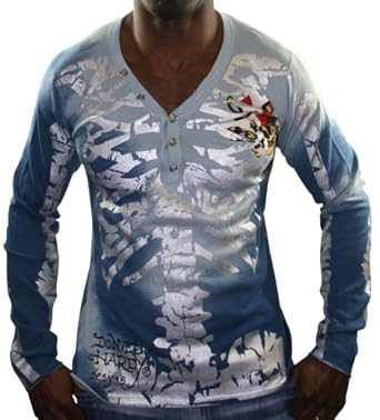 In 2004, Christian Audigier used the tattoo designs of Don Ed Hardy to inspire his world renowned Ed Hardy brand. The huge celebrity following of Ed Hardy has made it easily one of the world's most recognized brands. The front of the hoodie features the Ed Hardy signature, a skeleton graphic design in a metallic foil finish, and 5 button closure at V neckline. The back features the Ed Hardy signature, and the skeleton graphic print in a metallic finish. 100% Cotton. Dry clean only. Size M- Chest- 46", Length- 26" (laying flat). Size L- Chest- 48", Length- 27" (laying flat). Size XL- Chest- 50", Length- 28" (laying flat). Size 2XL- Chest- 52", Length- 29" (laying flat). Style EHM556.