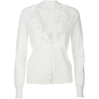 This fashionable cardigan features a button front, long sleeves, and deep V-neckline with ruffle detailing. Easy wear and care! Cotton. Nylon.