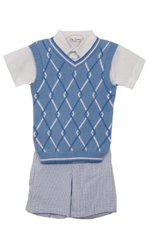3 piece set / V-neck sweater vest / Button front white shirt / Seersucker shorts have front zip and back elastic / By: B.T. Kids