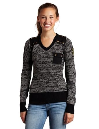 Southpole Juniors V-neck Long Sleeve Sweater with Stud Details and Arm Patch