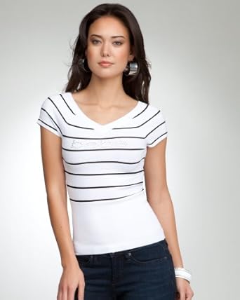 Give your logo looks a shot of nautical cool with this bebe sweater top, featuring classic embellished logo across front, double V-neckline, waist-accentuating ribbing and thin stripe print. Try it with a pair of high-waisted shorts. Offers a thin sweater stretch. Center back to hem: 23".